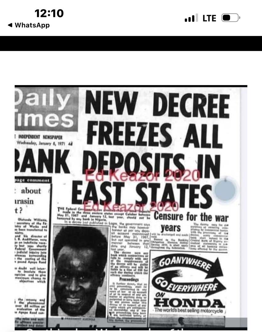 ON 6 January 1971, barely a year after the Biafran War ended, the Nigerian government enacted one of the most economically devastating policies in modern African history, a decree that froze all bank accounts belonging to Igbos and limited their access to their own wealth. Regardless of how much an Igbo individual had saved before or during the war, they were given only £20 per person, effectively erasing decades of financial security and throwing an already war-ravaged population into economic devastation.