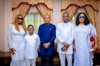 (l-r) Governor PETER MBAH in a photo op with his SSA Media, UCHE ANICHUKWU and his wife and children when the Governor paid the ANICHUKWU family a courtesy visit on the demise of their mother and family patriarch, Senior Mother in Israel, Josephine Anichukwu
