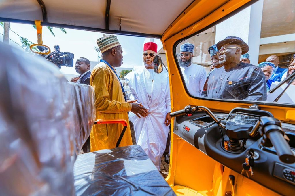 From Right: Vice President Kashim Shettima and Executive Vice Chairman,  National Agency for Science and Engineering Infrastructure (NASENI), Khalil Suleiman Halilu and Governor of Delta State,   Rt. Hon. Sheriff F. O. Oborevwor inspecting the Agency’s electric tricycles during the 152nd meeting of the National Economic Council (NEC) held at the Presidential Villa, Abuja on Thursday,  September 18, 2025.