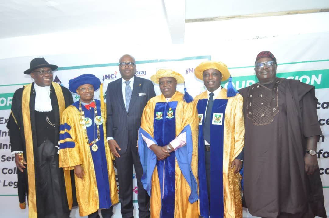 From left: Prince (Dr.) Richard Oma Ahonaruogho (SAN) – Legal Adviser, Prof. Lere Baale – President and Chairman of Council, Mr. Wale Oyedeji – Group Managing Director First Holdco PLC & Keynote Speaker, Alhaji Ahmed Yakassai – Vice President, Pharm. Lekan Asuni – Secretary General, and Adj Prof. Abiodun Osiyemi – of Babcock Business School. At the 2025 Investiture of Fellows of the Nigerian Academy of Pharmacy.