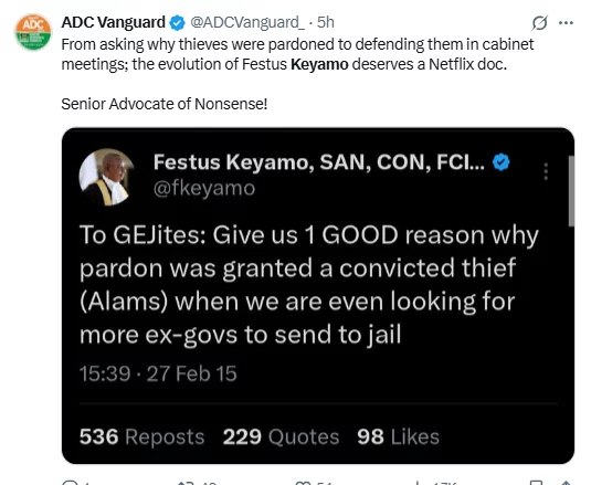 Nigerians have dug up an old tweet by Aviation Minister, Festus Keyamo, condemning the presidential pardon ex president Goodluck Jonathan, granted to former Bayelsa state governor, late Diepreye Alamiyeseigha.
