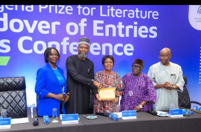 Second from left: Abdul Umar, Manager, Government Relations, representing the GM, External Relations & Sustainable Development, NLNG, hands over the 2026 entries for the Nigeria Prize for Literature to the Advisory Board on Monday in Lagos, as the Chairman of the Advisory Board, Prof. Akachi Adimora-Ezeigbo, receives the entries on behalf of the Board.