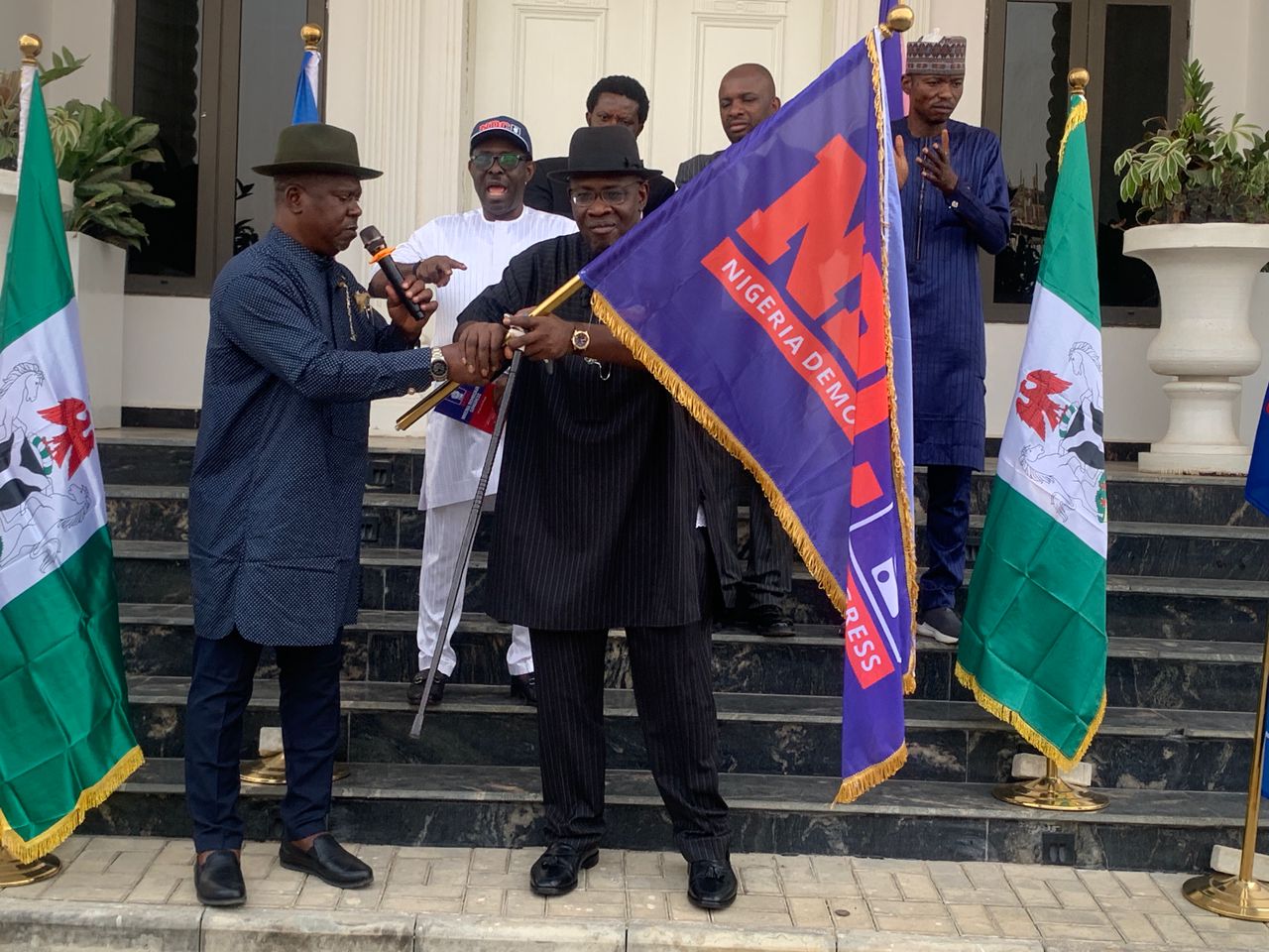 Senator Moses Cleopas, NDC National Chairman, handing the party's flag to Senator Seriake Dickson